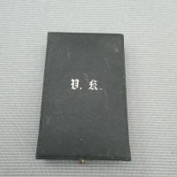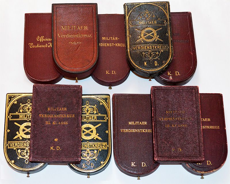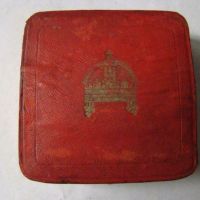 Nagyon jó, szinte újszerű állapotban lévő, zöld bársonnyal bélelt gyári tok, gyönyörű pecséttel. Hátulján pecsételt 1914 évszám. A poén az, hogy tizenegy darab arany és ezüst koronás és korona nélküli érdemkeresztem van, de pont nincs sima ezüst  Vincent Mayer's Söhne gyártmányú közöttük.