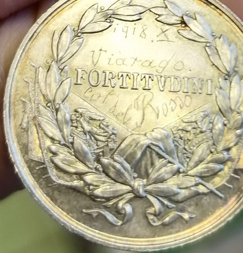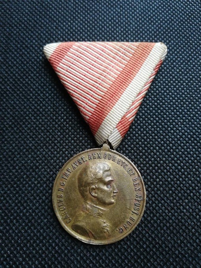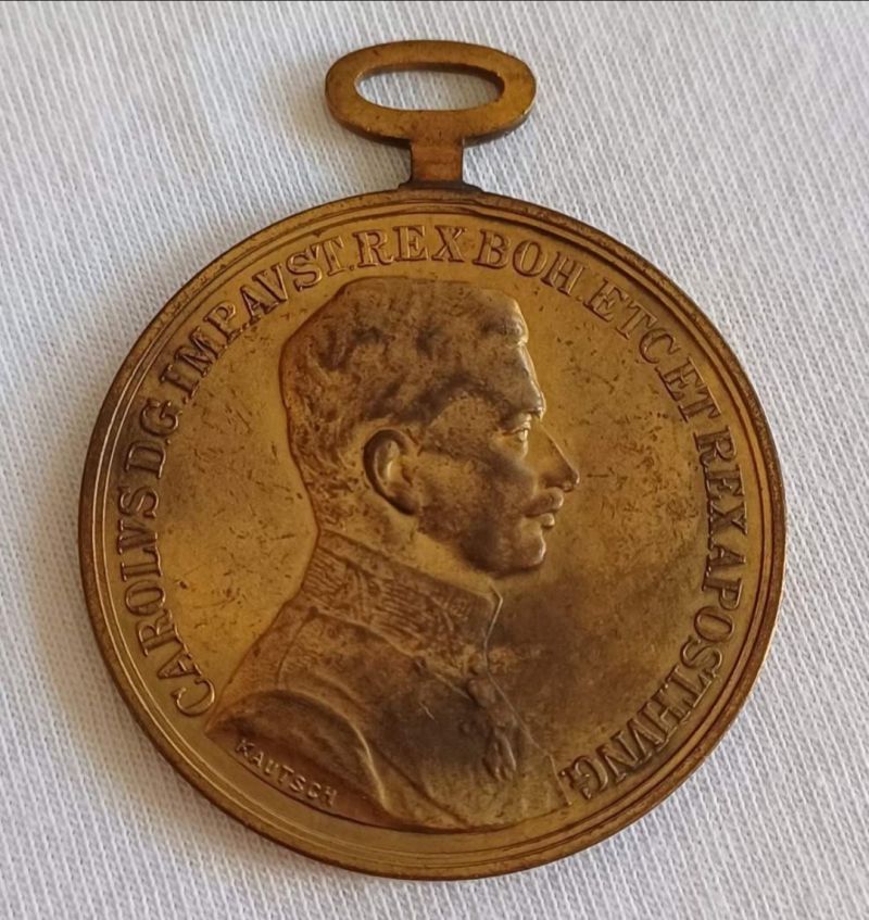 Inkább karcolt, mint vésett Károly "Kisezüst" (KAUTSCH). Jelzett ezüst, hátlapján „1918.X., Viarago col del Rosso” véséssel az éremképen ill. "Pikinek - Marci" véséssel a peremen. Hitelessége szerintem nem kétséges, szabad szemmel a vésés szinte nem is nagyon látható, az "1918" évszámon a két egyesen lévő pontot ebben a korszakban általánosan használták. Próbáltam utána nézni, ebben az időszakban bőven voltak magyar csapatok a környéken.