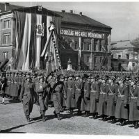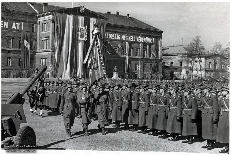 Az első képen látható középen a zászlót tartva egy Kossuth Akadémián tartott szemlén. Az épület a háttérbe természetesen a volt M. Kir Ludovika Akadémia épülete.
