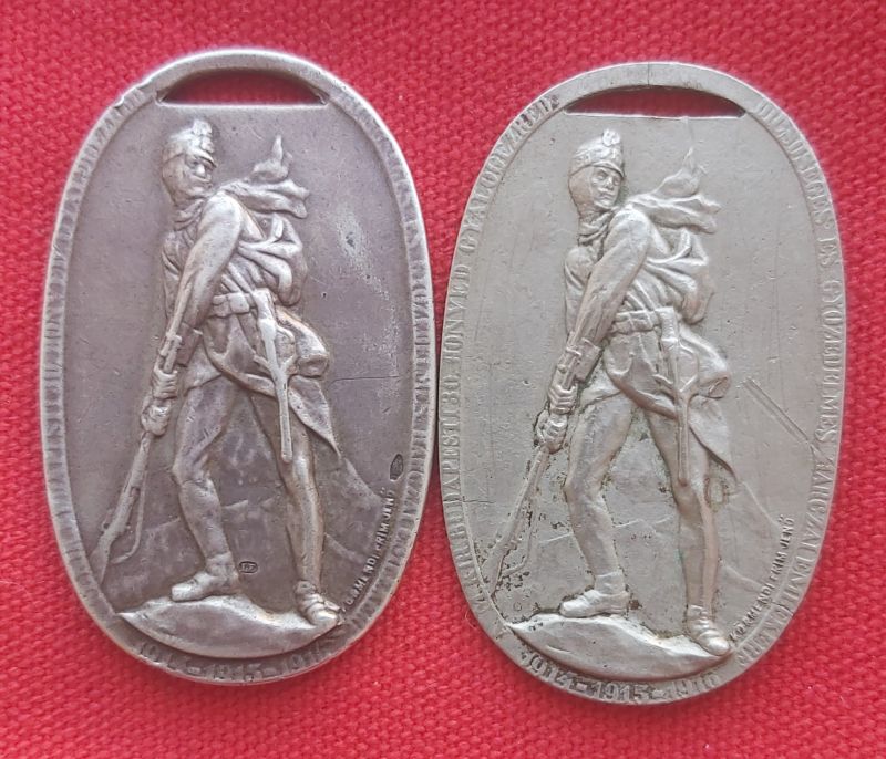 A dilemma: lehet hogy belefutottam egy másolatba? Vagy csak egy másik veretről van szó? A baloldali jelvény elméletileg ezüst alapú. A hátlapon ahol a ütközetek helyszínei vannak sorolva   eltérés van: a jobb oldalin nem Galicia alatt szerepel 1-2 helyszín megnevezésénél hanem a Kárpátok. A két darab mérete kb. azonos de a kialakítása különböző, a bőr felfüggesztő szíj bujtató része más méretű,  a karakterek -  és a szöveget lezáró jel szintén más, az előlapon a honvéd ábrázolása elnagyolt, nincs kézen fogható kontúr stb.