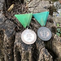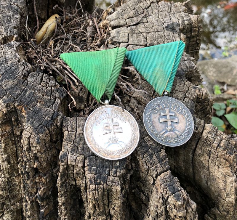 Régóta szerettem volna egy szépen megmaradt Ezüst Érdemérmet, most egyszerre kettőt is sikerült szereznem. Mindkettő eredeti, zöld szalagos és "bronz" beütős. Érdekesség, hogy az egyik beütője felül, a kitüntetés füle mellett található.