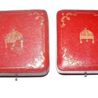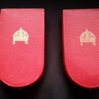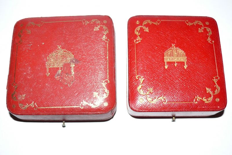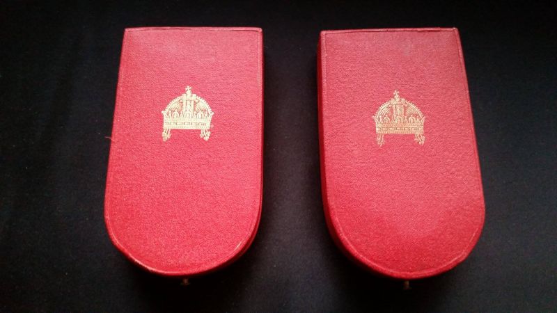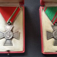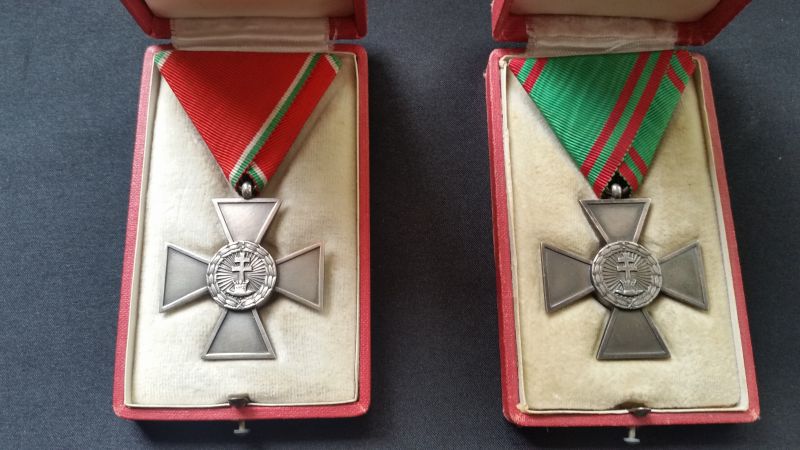 A Magyar Ezüst Érdemkereszt két jelzett darabja, az adományozható szalagváltozatokkal.