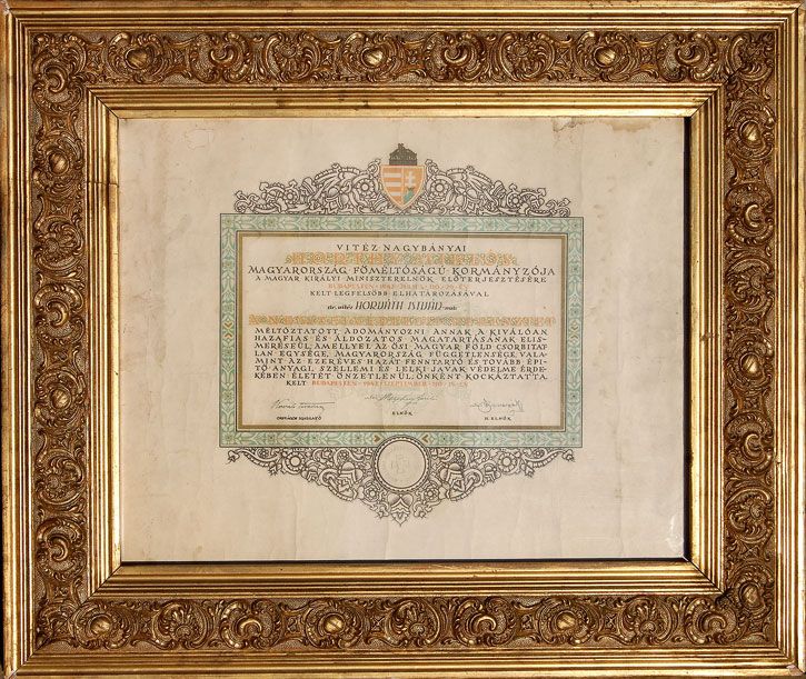 A Nemzetvédelmi Kereszt adományozó oklevele bekeretezve