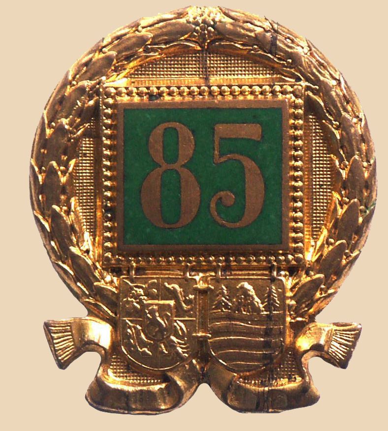 A jelvény alsó részén a két vármegye címere látható. A 85-ös szám azért van zöld mezőben, mert ez volt az ezred hajtókaszíne. A Monarchia közös gyalogezredeinek egyenruházatát a gyalogezredekre egyedül jellemző színekkel egymástól megkülönböztették.