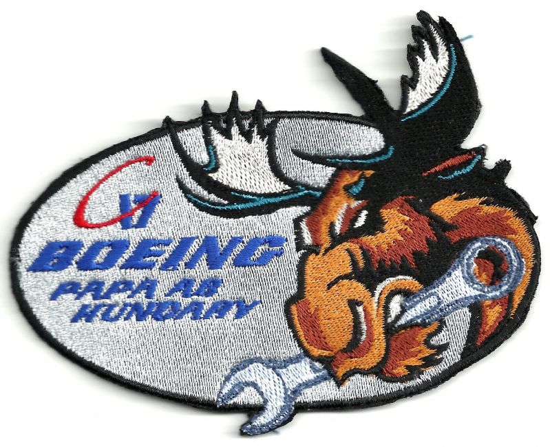Ez a pápai C-17-esek karbantartóinak új karjelzése. Ők nem katonák, hanem a Boeing civil alkalmazottai. Nekem nagyon tetszik. A C-17-est Moose-nak, azaz Jávorszarvasnak becézik, innen a jelképválasztás a felvarrón. Igen harcias karbantartó.