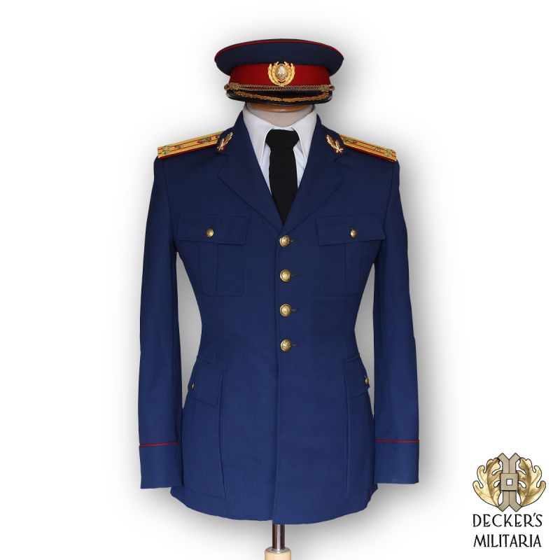Fésűsszövetből készült igényes, szuperslankított darab, az ujjakon és a nadrág (a képen nem látható, de megvan) oldalán vörös szegélyezéssel. A bőr szemernyős sapka ugyanezeket a színeket viseli magán. A zubbony vállán a szovjet ihletésű váll-lapokon a három csillag felett igazságügyi fegyvernemi jelzés (pajzs alapon kard és mérleg) látható.
