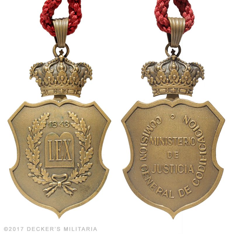 A képen a spanyol jelképrendszer egy újabb, szépen kidolgozott képviselője, egy modern igazságügyi jelvény látható, amit sodrott vörös selyemzsinóron visel(t) a tulajdonosa. Az biztos, hogy igazságügy-minisztériumi darab, a kodifikációs bizottság tagjáé volt, de pontosabb információt nem tudtam szerezni róla.