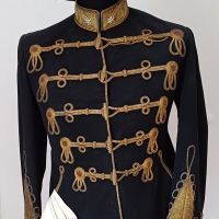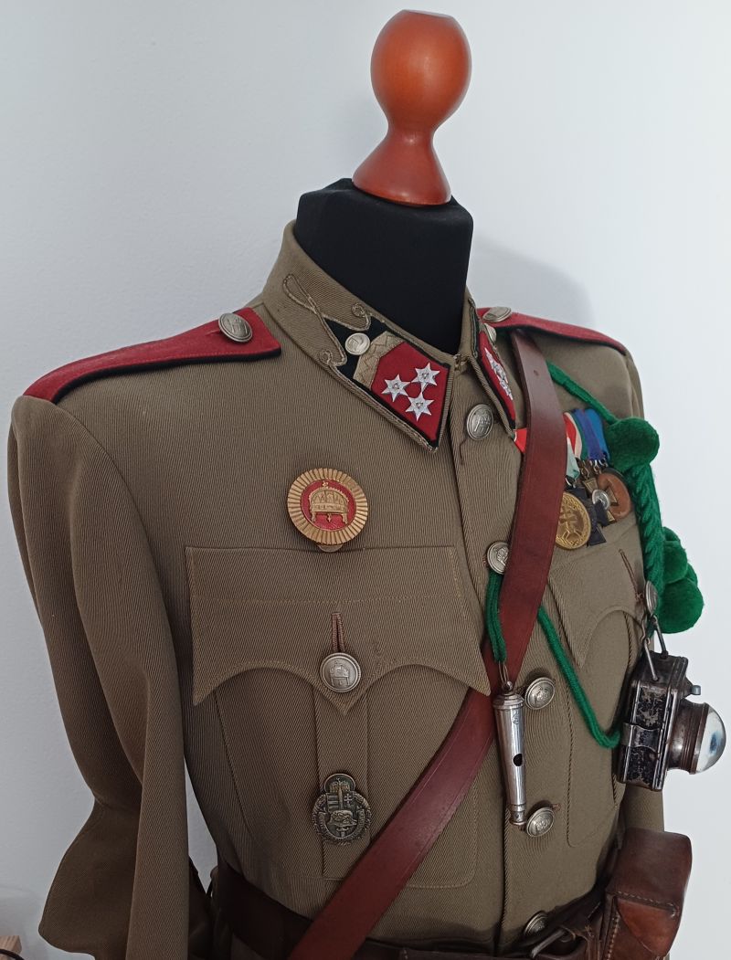 Egy pénzügyőr egyenruhában volt benne.(Soha nem hordott darab.Abból gondolom, mert a nyak részen lógott. Nem lett volna kényelmes hordani). A ruha menthetetlen volt A plomba viszont szépen megmaradt. Az egyenruhát az évek meg a molyok sajnos nem kímélték. A zöld posztóból se sok maradt. Az egyenruha gyártója Trunkhahn volt akik a csendőrségnek is szabtak egyenruhát.