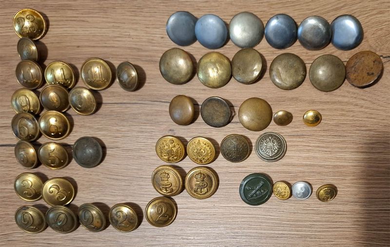 Ezek mind monarchiás gombok, ha jól gondolom. Két nagyobb csoport a számozott sárga és a nagyobb méretű sárga vagy ezüst színű gomb. Ez utóbbiak lehettek a közös gyalogezredek gombjai (zubbony vagy köpeny?), mert a közös ezredeknél a gombszín is hozzátartozott a 102 ezredet egymástól megkülömböztető jelzés rendszernek. A számozott gombok a Landwehr ezredeknél voltak, vagy esetleg a tábori vadászoknál is? Esetleg a honvédeknél? Mert ezeknek az ezredeknek egyforma színű volt a gallér hajtókájuk és a gombszínük is, tehát az azonosításhoz kellett az ezredszám. Szóval, az egyik kérdés az, hogy a számozott gombok egyformán lehettek Landwehr, vadász vagy honvéd gyalogezred gombok?