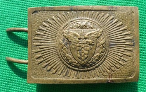 Én eddig csak olyan övcsatokkal találkoztam, amin a birodalmi kétfejű sas volt látható. Honvédeknél a magyar címer. Úgy tudom, hogy a kettős (hármas) címert hivatalos használatra 1915 végén vezették be. Lett volna bőven idő megfelelő övcsatokat is gyártani. Mégis, egészen mostanáig nem láttam ezt a csatot. Fotókon is mindig a sasos csat látszik.