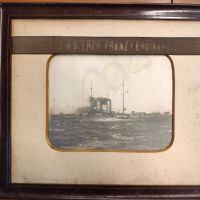 Az SMS Erzh. Franz Ferdinand osztrák-magyar hadihajó bekeretezett fotója (kerettel együtt 43 × 37cm), amelynek különlegessége, a képpel együtt bekeretezett eredeti matrózsapkához való szalag.