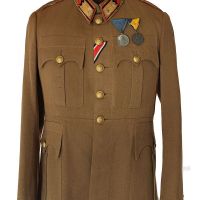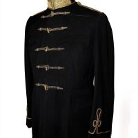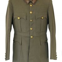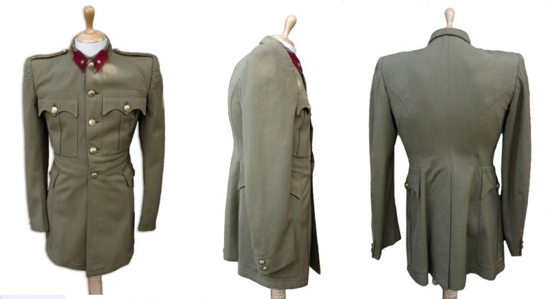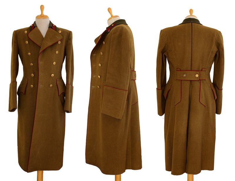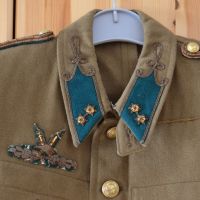 Magas, de nagyon vékony műszaki tisztviselő alezredes (meggyvörös posztó hajtóka és paszpolozás) köpenye. Az stráfok nincsenek a köpenyen, de a helyük halványan látszik, a szélességből lehet következtetni arra, hogy két sáv lehetett ott..