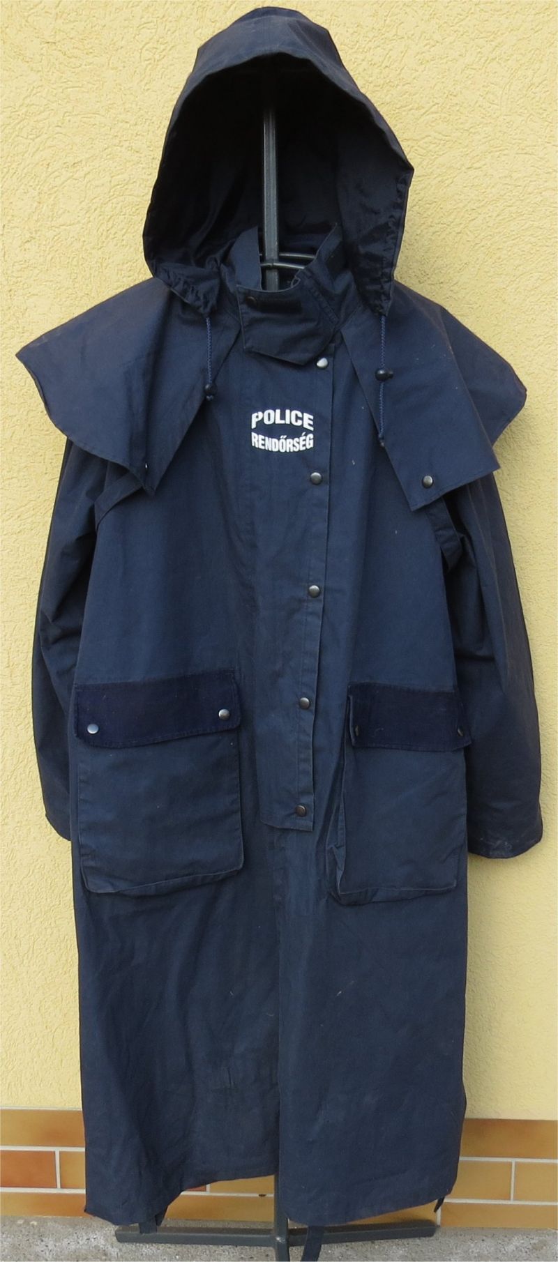 Az 1987-es egyenruhareformot követően az 1989-es rendszerváltás hozott érdekes színezeteket a Rendőrség egyenruházatában. Jó pár egyenruházaton megjelent a "POLICE" felirat (bűnügyi technikus, lovas, terrorelhárító, tűzszerész, .....). A 90-es évek elején a lovas szakszolgálatot fejlesztették, méneseket vásároltak. A címképen levő esőköpeny a lovasok részére készült, hátulján derékig érő, gombolható hasítékkal. Színe sötétkék. Több hónapnyi "nyomozás" után sem tudtam meghatározni a rendszeresítés évét.