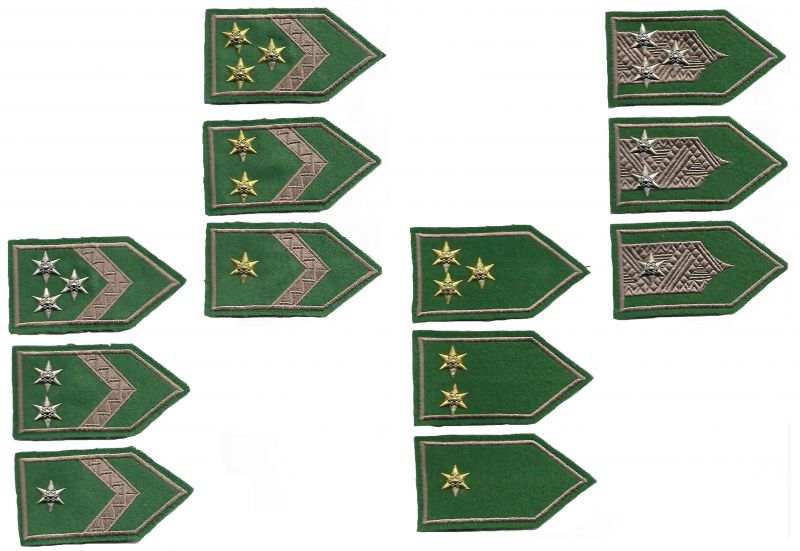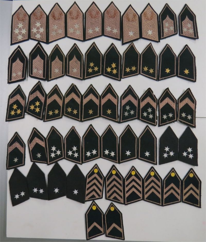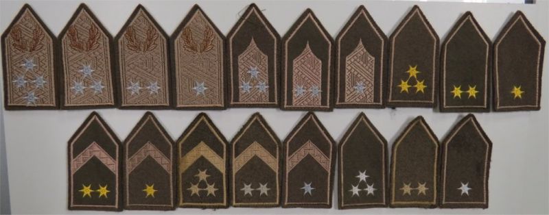A társasági és köznapi kistársasági paroli jelzések sajnos még nem kerültek a gyűjteményembe, viszont a többit be tudom mutatni. Bizonyos rendfokozatok elkészítésére nem került sor az intézkedésben foglaltakkal ellentétben. Ennek egyszerű az oka, a MH nem rendelt belőlük. Ezek a tisztesi rendfokozatok valamint az altábornagyi és vezérezredesi rendfokozat.