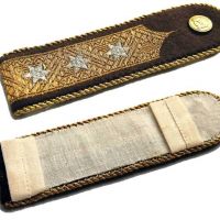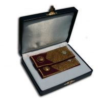 A két váll-szalagon a KV stilizált jelvénye van hímezve, de valaki valamiért két szúrógombot rögzített pont fölé. Viszont látszott a dobozon, hogy vitrinben lehetett, mert a belseje is jó poros volt. :)