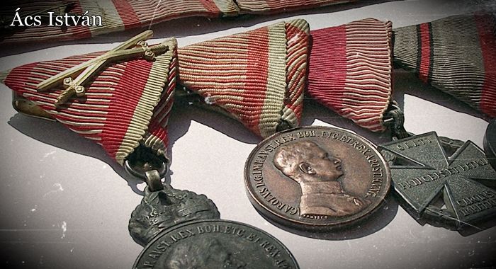 Viselt kitüntetéseinek szalagsávsora rekonstruált kitüntetéssorral.