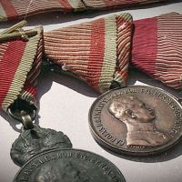 Elég érdekes koncepció. Egyenes vörös színű,két fehér sávos szalaggal adományozták, de háromszög szalagon viselve még nem láttam.