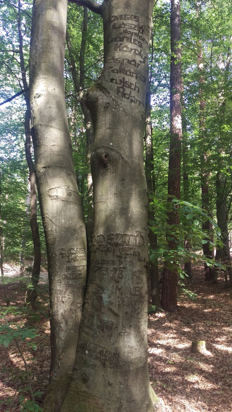 Ma délután egy kicsit kerékpároztam, amikor az útról feltűnt az alábbi fa látványa. Régebben már az erdőben is sokkal találkoztam anno, hisz a rendszerváltásig szinte az egész terület a határsávba tartozott. Anno elég jelentős volt a határőrség jelenléte a környező településeken ill. erdőkben. Az évszámokból kiderül, hogy a sorozott állomány akart anno emléket hagyni maga után az utókornak. Ma még láthatóak többnyire ezek a dolgok, de idővel sajnos el fognak tűnni. Gondoltam érdekességkép megosztom veletek, bár tudom akinek volt benne része nem fogok neki újat mutatni :) A képen látható fa mellett volt még 2 amin hasonló felíratok voltak, de ennél a fánál érdekes, hogy jó magasra írták.....lehet létra segítségével. Az évszámok a 70-es évektől kezdődnek többnyire.