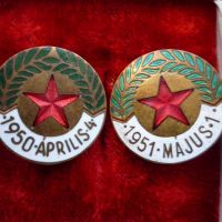 A keret marad, a felirat változik,1950. április 4. és ugyanaz 1951 május 1. alkalmából. Aranyozott, zománcos kitűző különböző alkalomra elkészítve. Ezek is a Néphadsereg gondozása mellett keletkeztek.