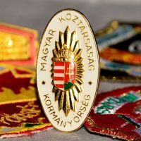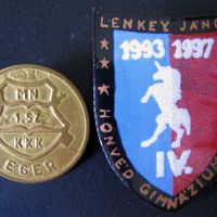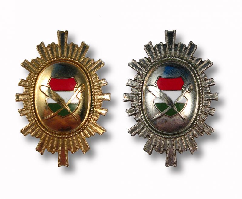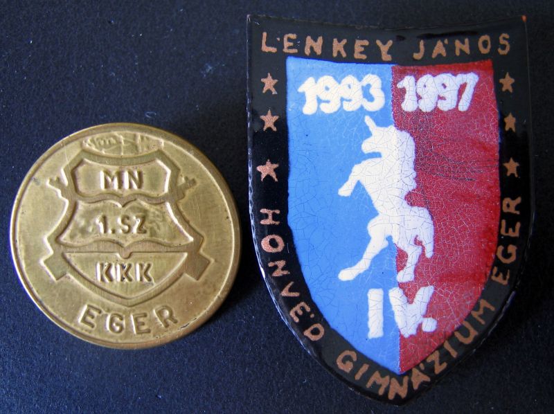 Végzettségi jelvények (egyetemi, ill. főiskolai). Ismereteim szerint mindkettőből létezik zománcos és műgyantás típus is, ezek az utóbbiak.