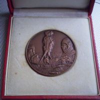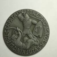 A 100 mm átmérőjű kétoldalas bronzplakett Győrfi Sándor munkája.