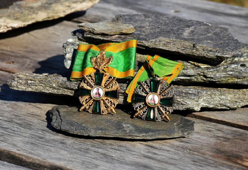 Zahringeri Oroszlán. Képen a lovagkereszt kardos első és másod osztálya látható. Jelen esetben az első osztály tölgyfaleveles dekorációval.