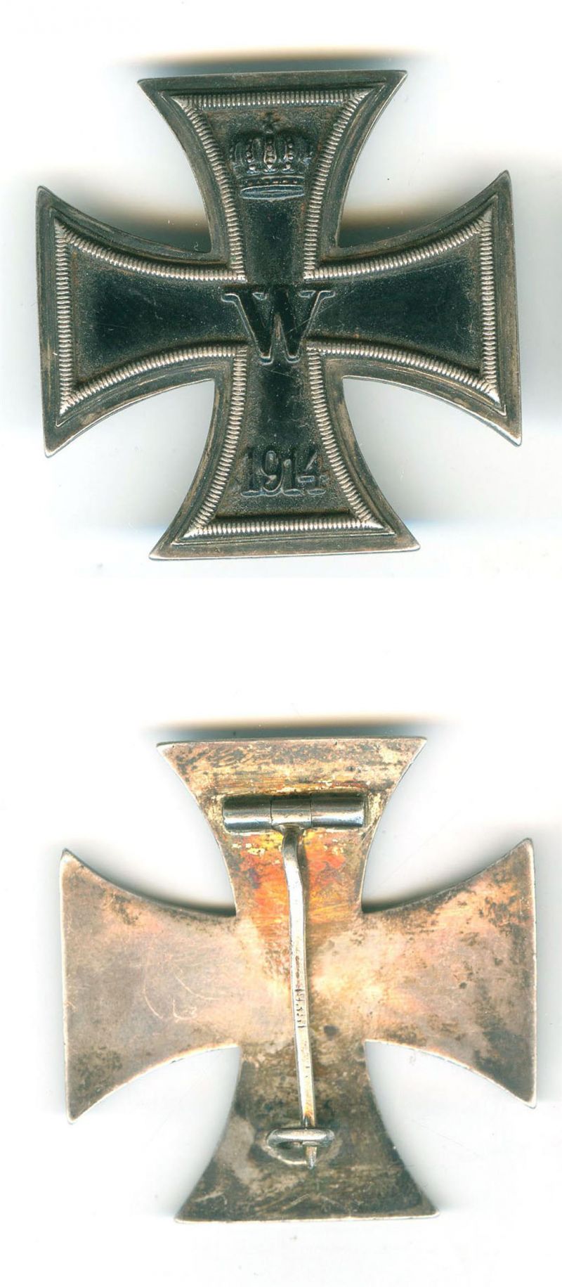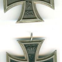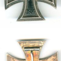 A porosz- és a háromszög-szalagos II. osztályú Vaskereszt, egy német és egy monarchiabeli hazafias jelvénnyel, melyeken a vaskereszt, mint motívum szerepel. középen egy korabeli patriota kávéscsésze alátéttel.