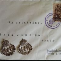 Híradó/távírász fegyvernemi jelvények párban, zászlós úrnak címzett boríték, Nagykanizsa Károly laktanya távbeszélő század. Saját gyűjteményi darabok. A pecsétet még nem sikerült megfejteni, ha megtalálom leírom a feladó helyet.
