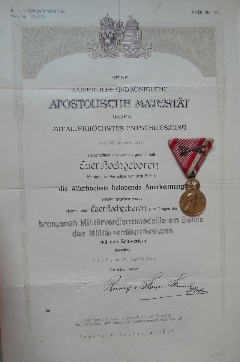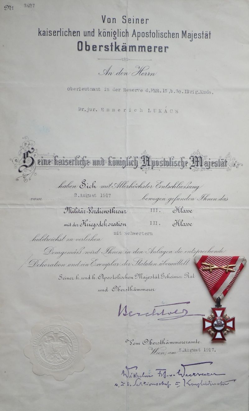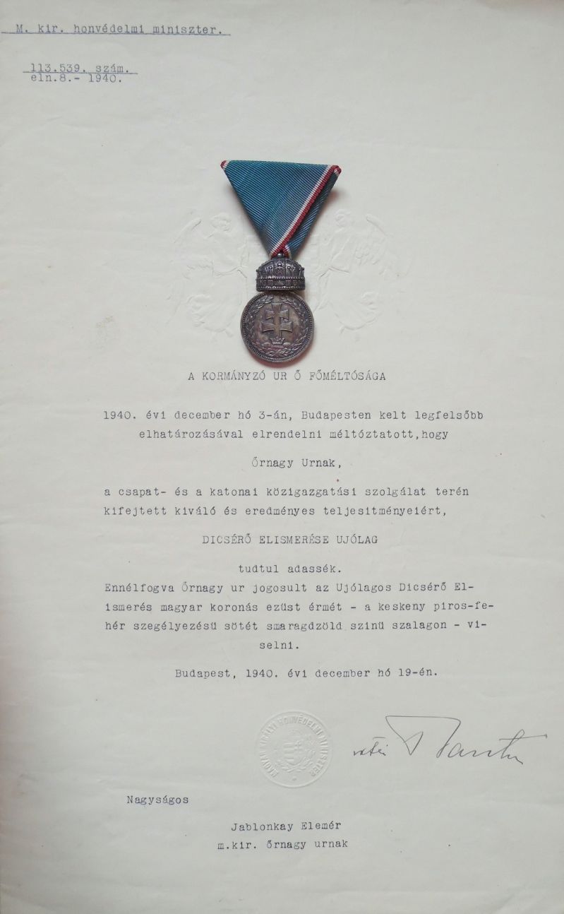A sok katonai kitüntetés mellett egy civil/egyházi érdekesség, Magyarország hercegprímásának dombornyomott fejléces papírján és sk. aláírásával.