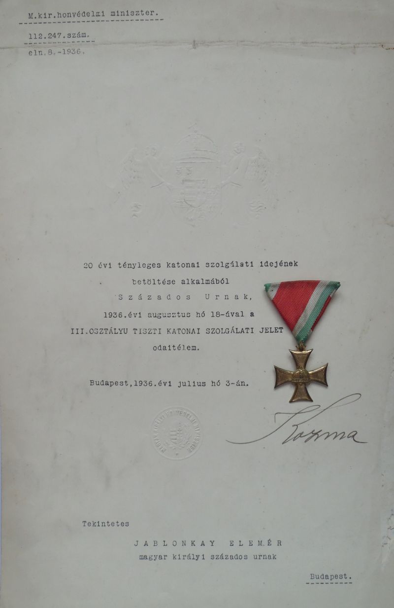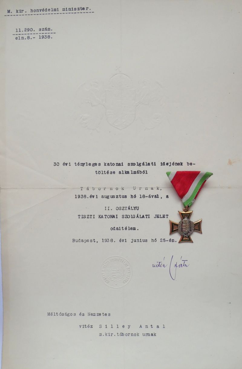 Horthy II. osztályú Tiszti Katonai Szolgálati Jel adományozó irata Silley Antal tábornok részére