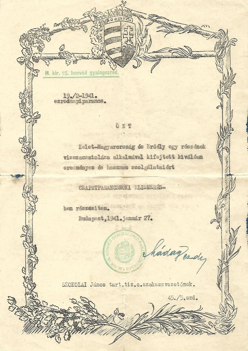 A sokféle módon dekorált okmányok egyike, a M.kir. 15. Honvéd gyalogezredé. Ezt nagypapám kapta.