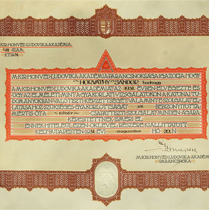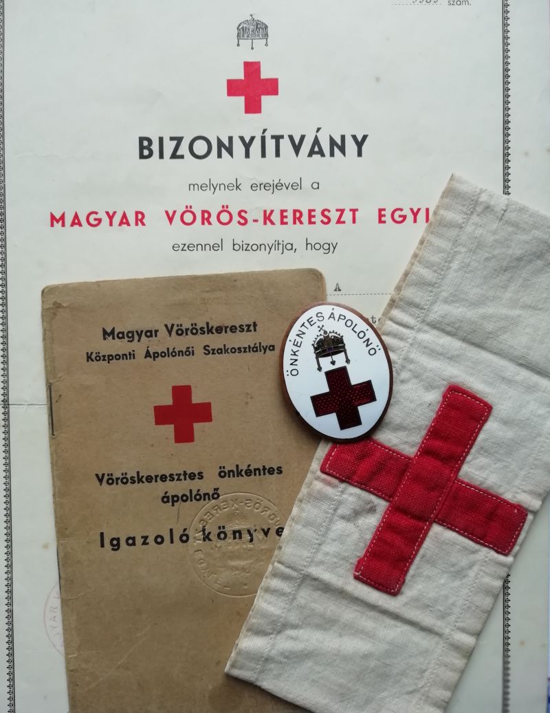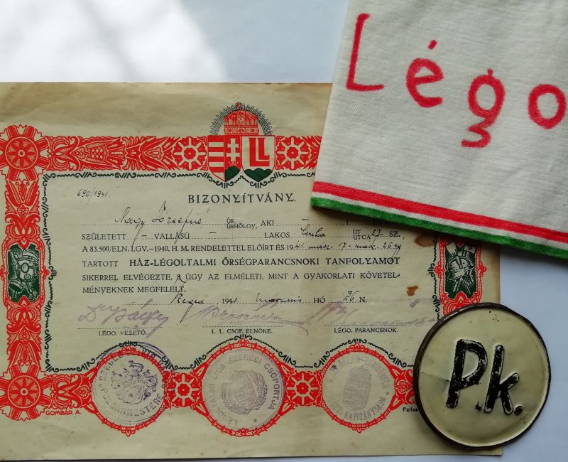 A bizonyítványt Szegeden állították ki 1941-ben, 3 különböző pecsét is van az iraton. Jelvény, karszalag mellette.