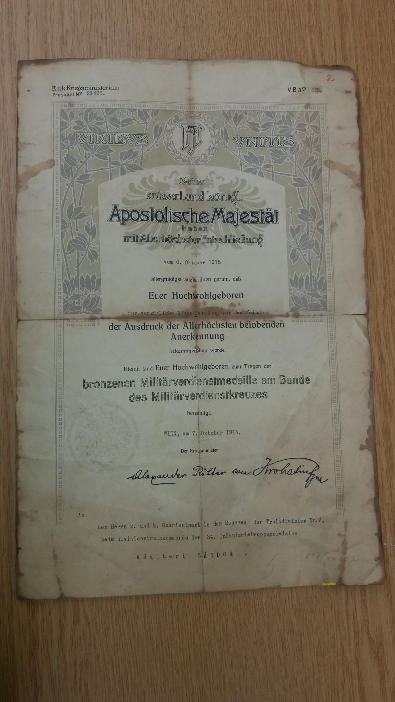 "Bronz Signum" adományozó lehet? Magyar tiszt részére: Adalbert Sándor. 1915.október 7. Wien