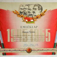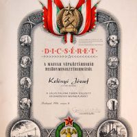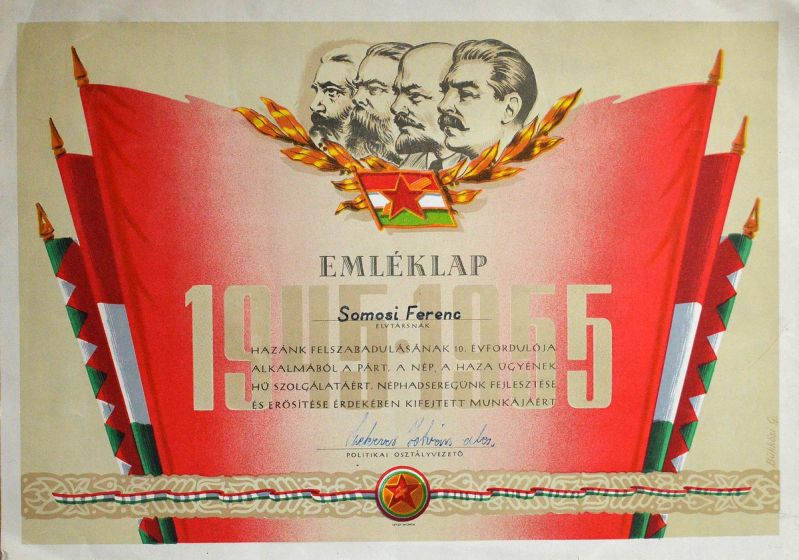 Érdekes, hogy az oklevélen az egyetlen alkalommal, 1955-ben adományozott, nagy kerek alapra helyezett, jelvény látható, igaz, "Kádár-címerrel" rajzolva, amilyen jelvény viszont nem is volt a valóságban.