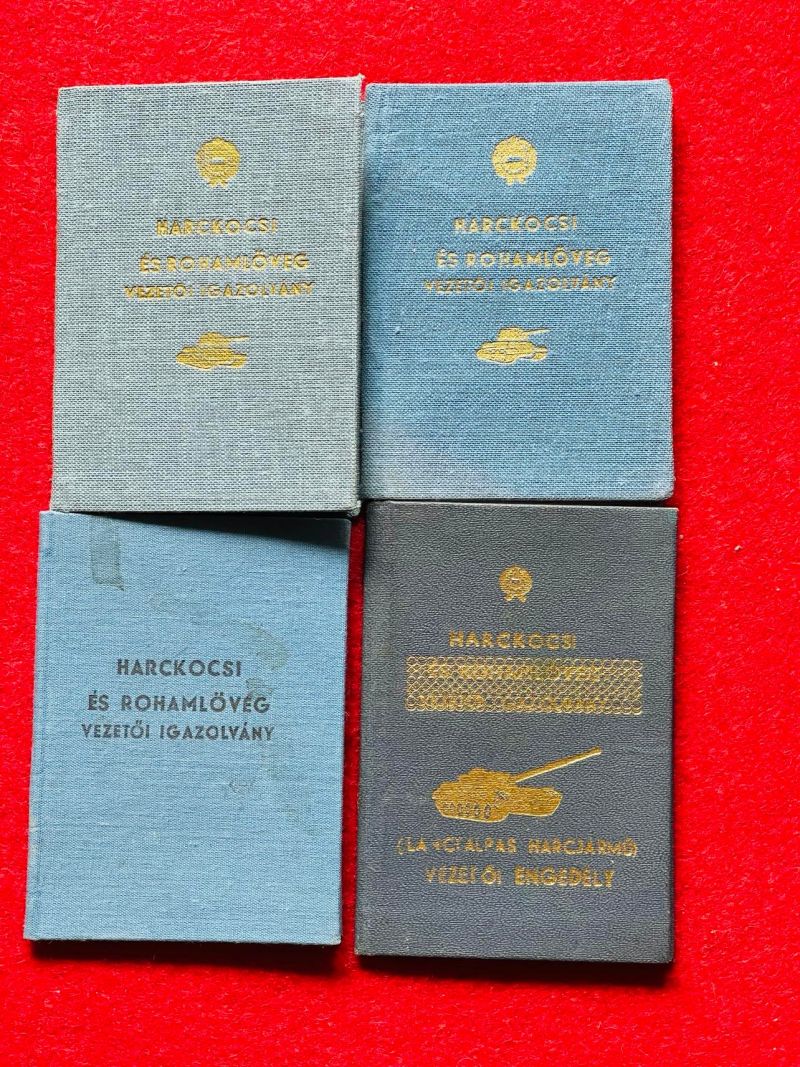 Különböző feliratú és színű " harckocsi és rohamlöveg vezetői" és "harckocsi (lánctalpas harcjármű) vezetői engedélyek.