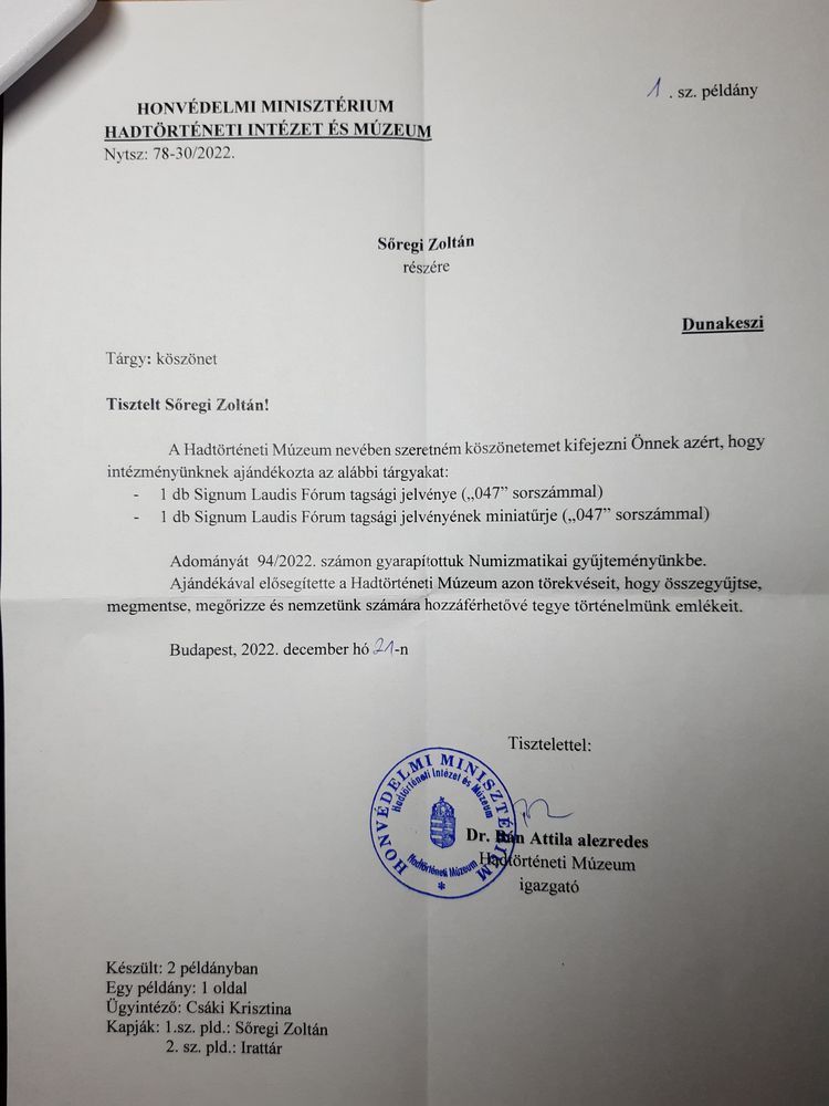 Ma kaptam kézhez a Hadtörténeti Múzeum levelét, amelyben a fórumjelvény ajándékozását köszönték meg.