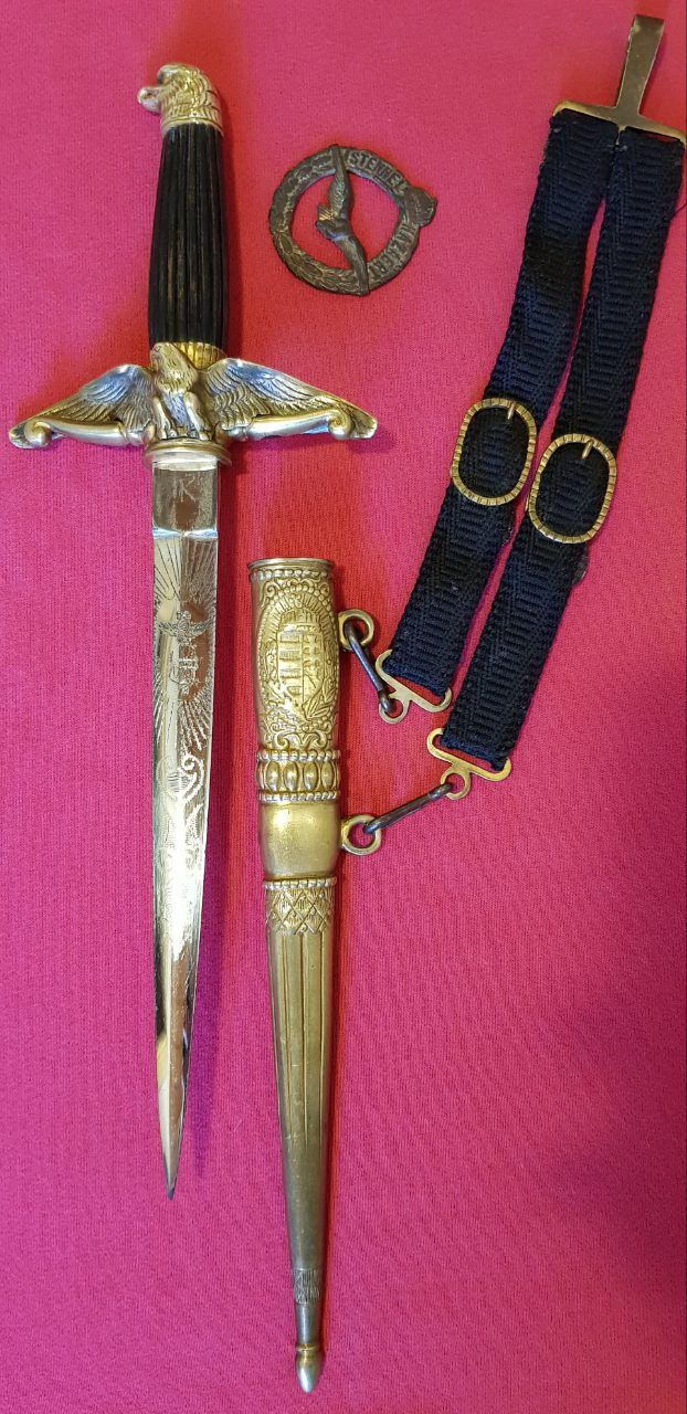 Régebben keresőztem és Bicskén, a hegyikastélynál találtam egy repülőtiszti övcsat előlapját. Fél éve lehetőségem nyílt egy szép tőr beszerzésére és később egy övcsatra is. Egy álom vált valóra! A tőr a szentgotthárdi kaszagyár terméke, a komplett övcsat pedig Morzsányi.
