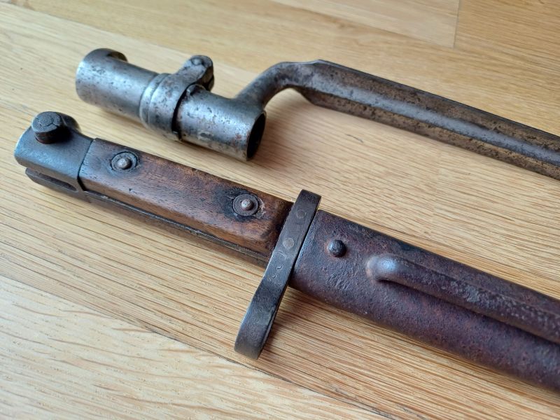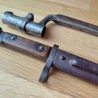 Szép állapotban lévő célzótüskés bajonett. Megmaradt az eredeti tábori zöld festés a tokon, továbbá eredeti papucs és bojt. Kredenclelet.
