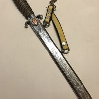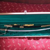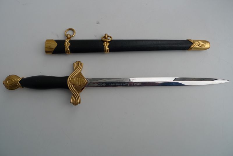 A honvédelmi miniszter, Kárpáti Ferenc ajándéka volt ez a kard nagyapám számára a 70-ik születésnapja alkalmából, 1986. január 22-ikén. Gyönyörű zöld bársonybetétes dobozban, díszhüvelyben.
